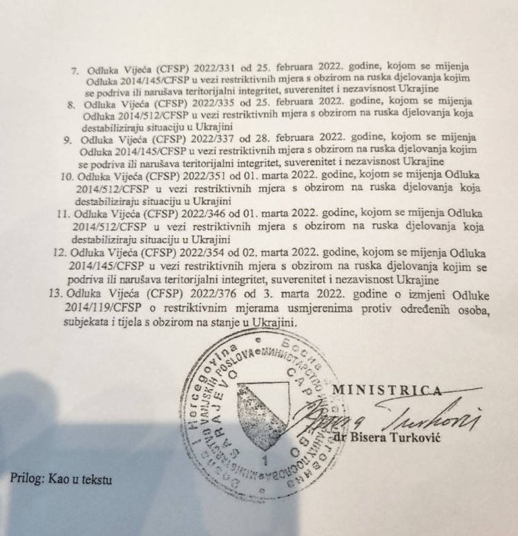 Ministarka spoljnih poslova u Savjetu ministara Bisera Turković ponovo djeluje samoinicijativno, a to potvrđuje i dokument od 11. marta ove godine koji je u posjedu RTRS, a koji je Turkovićeva bez institucionalne odluke, proslijedila kao instrukciju svim institucijama BiH.