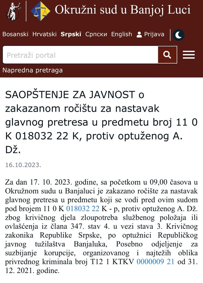Na suđenju bivšem premijeru Republike Srpske Aleksandru Džombiću koje prate i posmatrači Transparency Internationala u BiH, danas je došlo do izmjene optužnice a ročište je održano prije nego što je najavljeno, tako da je sve prošlo bez prisustva medija i javnosti. Današnje suđenje bilo je zakazano za 9:00 časova kako je objavljeno u saopštenju za javnosti kao i na Rasporedu suđenja na zvaničnom sajtu Okružnog suda u Banjaluci.