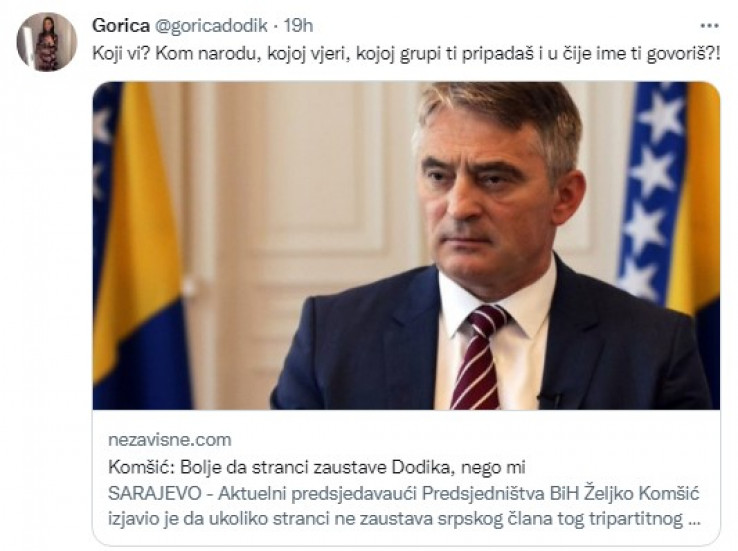 Ni ovo političko prepucavanje Dodika nije prošlo bez komentara njegove kćerke Gorice, koja je na Twitteru, uz Komšićevu izjavu, napisala: