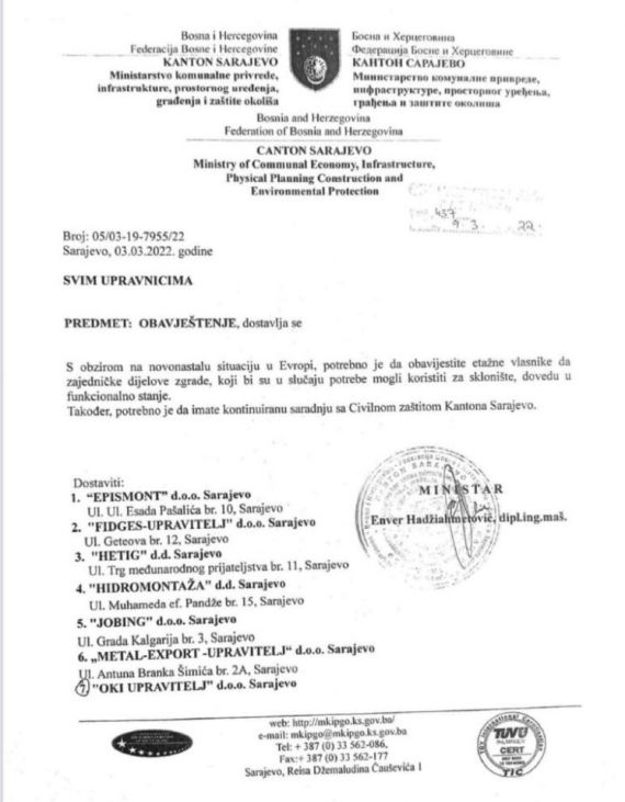 Ministarstvo komunalne privrede, infrastrukture, prostornog uređenja, građenja i zaštite okolišta Kantona Sarajevo poslalo je dopis upravnicima stambenih prostora u kojem pozivaju da etažni vlasnici zajedničke prostore dijelove zgrade očiste.