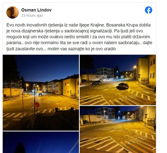 "Evo novih inovativnih rješenja iz naše lijepe Krajine. Bosanska Krupa dobila je nova dizajnerska rješenja u saobraćajnoj signalizaciji. Pa ljudi je li ovo moguće, koji um može ovakvo nešto smisliti i za ovo mu isto platiti državnim parama.. ovo nije normalno šta se sve radi u ovom našem saobraćaju.. dajte ljudi zaustavite ovo... molim vas saznajte ko je ovo uradio".
