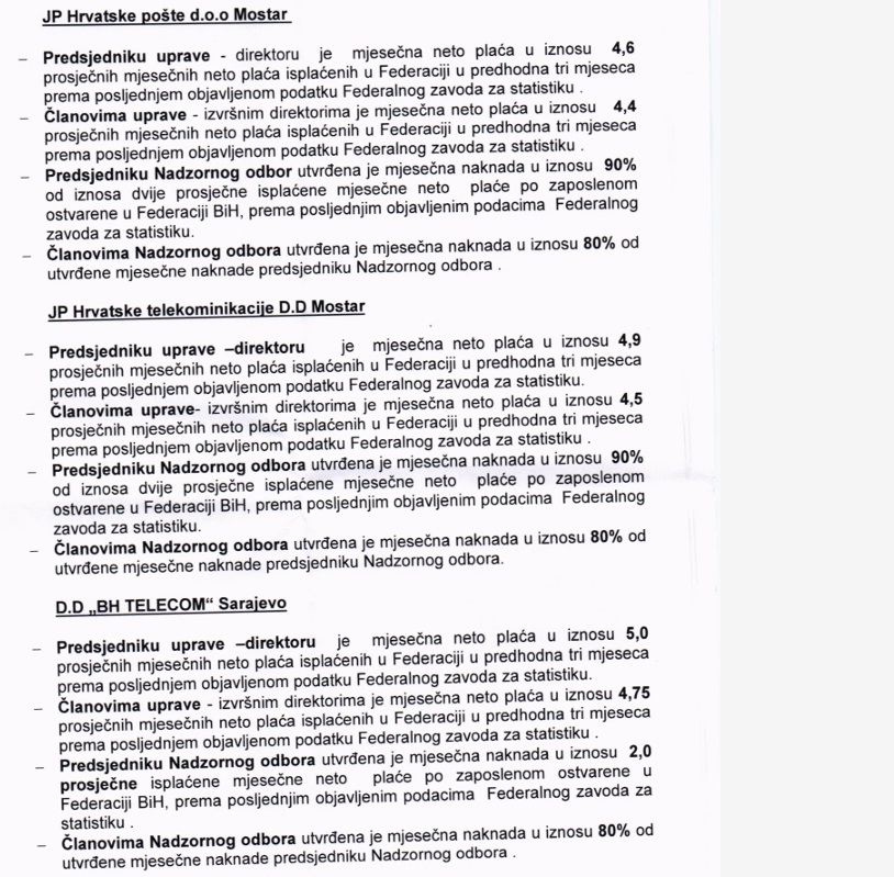 Ministarstvo prometa i komunikacija FBiH dostavilo je Predstavničkom domu Parlamenta FBiH podatke o mjesečnim neto platama direktora BH Telecoma, HT-a Mostar, Hrvatske pošte Mostar, zatim Bh. pošte Sarajevo, Autocesta FBiH, Cesta FBiH, kao i javnih preduzeća Ceste Mostar, Sarajevoputevi, Međunarodnog aerodroma Sarajevo i Željeznica FBiH.