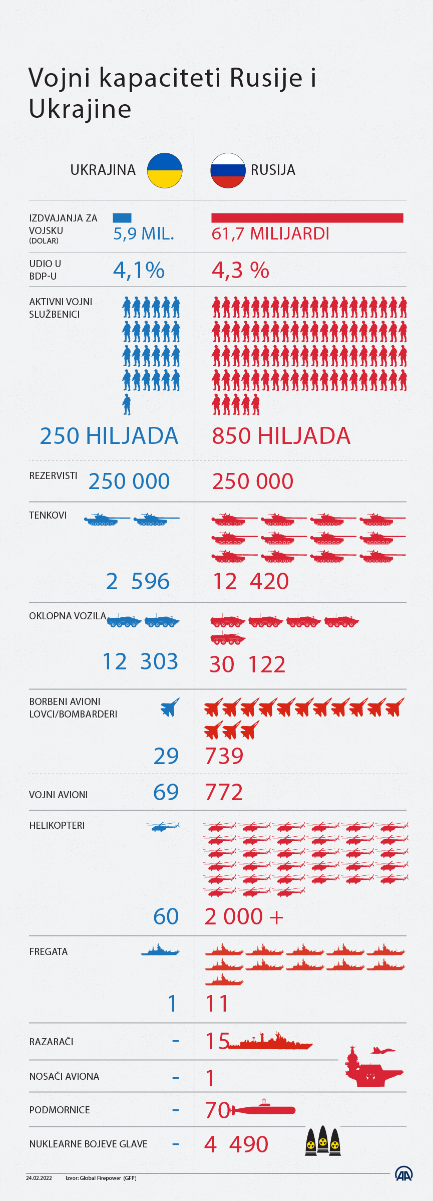 Trenutni kapaciteti ruske i ukrajinske vojske na osnovu podataka GlobalFirepower (GFP), portala koji priprema analitičke baze podataka o vojnim snagama zemalja u svijetu, kao i dostupne izvore u Rusiji i Ukrajini