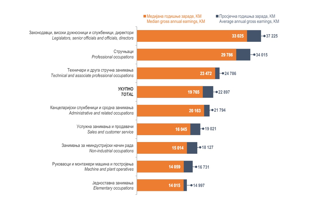 Najviše zarade imaju zaposleni u visokim pozicijama, kao što su zakonodavci, visoki dužnosnici i direktori, sa prosječnom zaradom od 37,225 KM. Takođe, postoji značajna razlika u zaradama između različitih profesija, pri čemu stručnjaci zarađuju gotovo duplo više od zaposlenih u uslužnim zanimanjima i prodaji. Ove informacije ukazuju na veliku nejednakost u zaradama među različitim grupama zaposlenih i između polova.