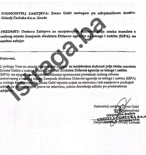 U Galićevom zahtjevu je naveden datum razrješenja 8. juli kada je i pobjegao iz BiH kako bi izbjegao hapšenje po nalogu Tužilaštva BiH za krivično djelo primanje dara.