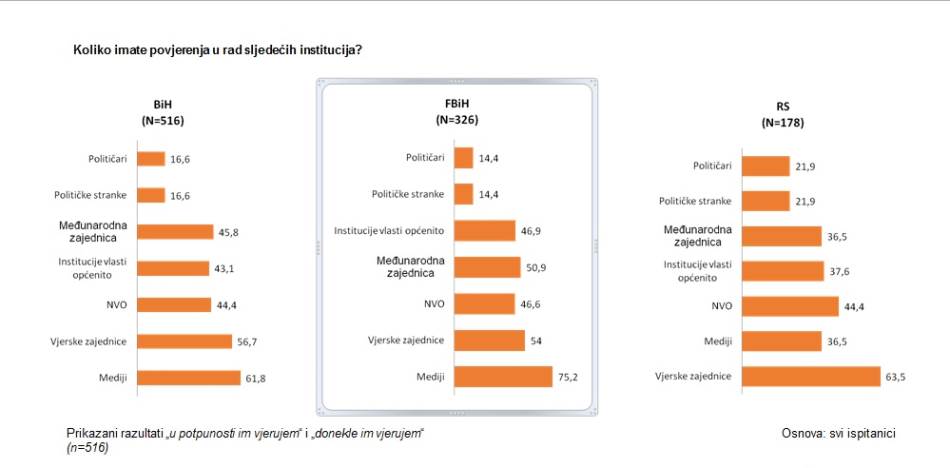 Građani Bosne i Hercegovine najviše vjeruju medijima (61,8 odsto) i vjerskim zajednicama (56,7 odsto), dok su političke stranke i političari pridobili najmanje povjerenja od građana (16,6 odsto).