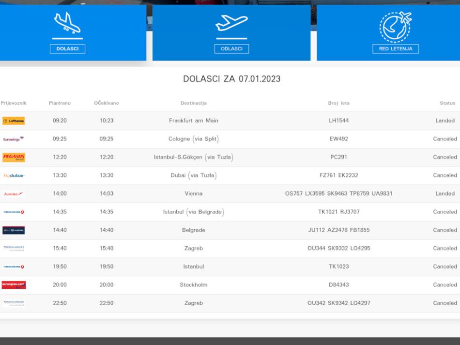Avion iz Istanbula je trebalo da sleti na Međunarodni aerodrom Sarajevo u 19.50, "Norvegian Air Shuttle" u 20.00, a "Croatie Airlines" u 22.50 večeras.